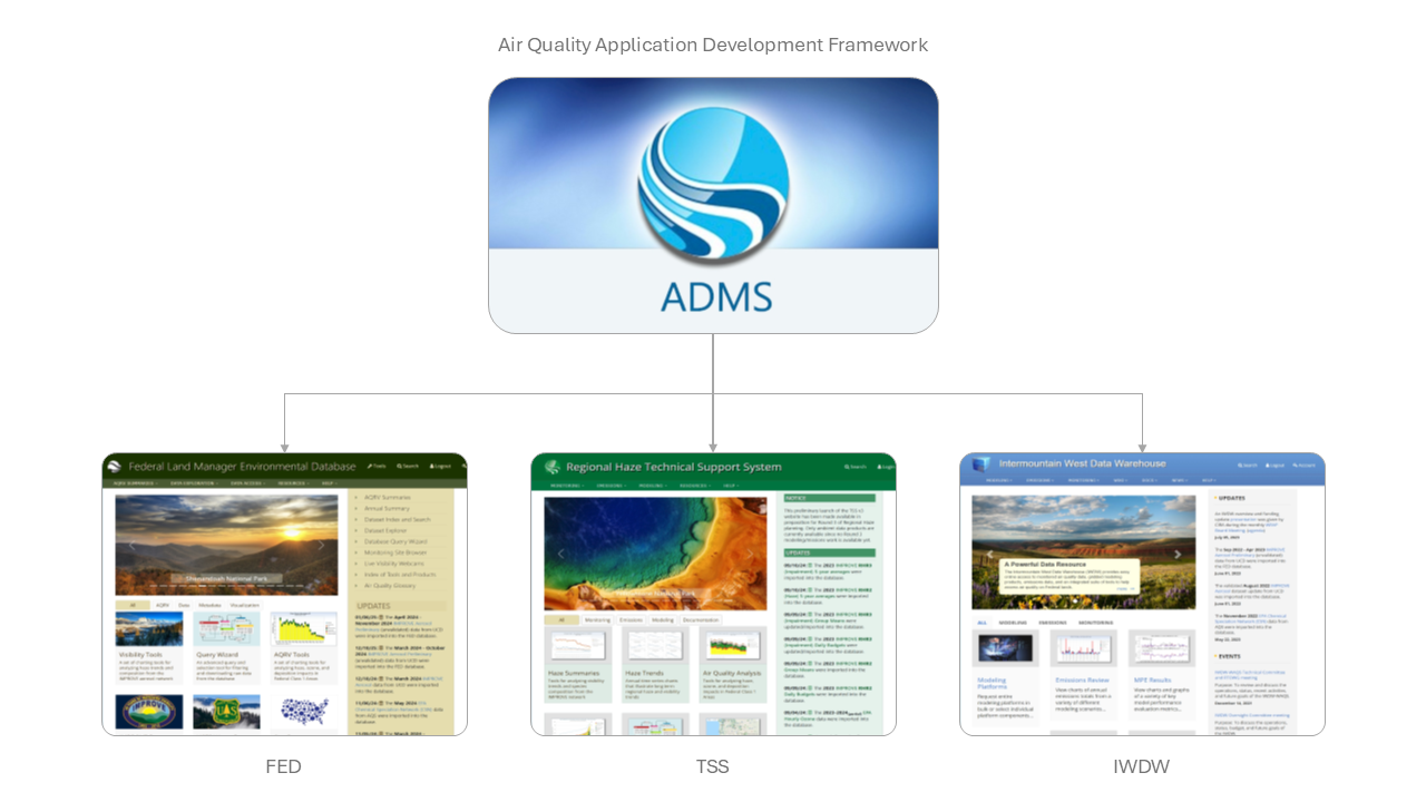| 2011 | Air Data Management System (ADMS) | At this point, the components of VIEWS had been successfully leveraged, adapted, and extended many times such that it was becoming clear it would be beneficial to more rigorously and thoroughly synthesize the growing VIEWS architecture into an even more general-purpose and extensible framework for developing future air quality applications in order to further increase development, refinement, and operational efficiencies over time. So the components and subsystems of VIEWS were rearchitected from the ground up as an enterprise-level information technology framework using aspects of the design paradigms that had resulted from the CyAir effort. As a result, the applications that had leveraged the original VIEWS architecture—as well as VIEWS itself—now became derivative applications (or "skins") of the rearchitected and more fundamental ADMS framework. |