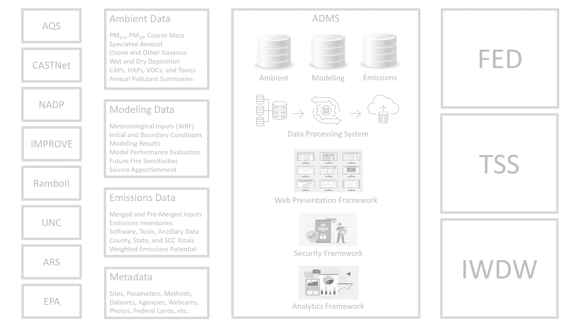 | 2013 | Three-State Data Warehouse (TSDW) | The Three-State Data Warehouse effort kicked off in earnest during early 2013. The ADMS framework was leveraged substantially to develop the database, software, and website foundation for the TSDW, and the TSDW began servicing online requests for modeling platform components by the end of the year. The TSDW was the second major application (after FED) to be built from the ground up using the new ADMS framework. |